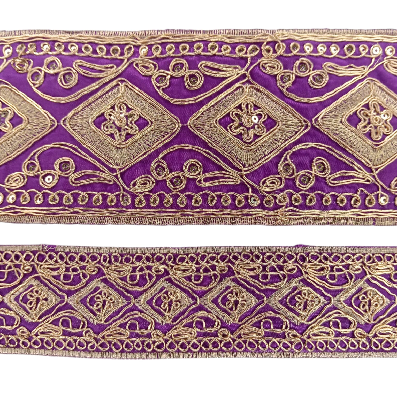 - Pasamanería con bordado metalizado sobre tela lamé con 45 milímetros de ancho.